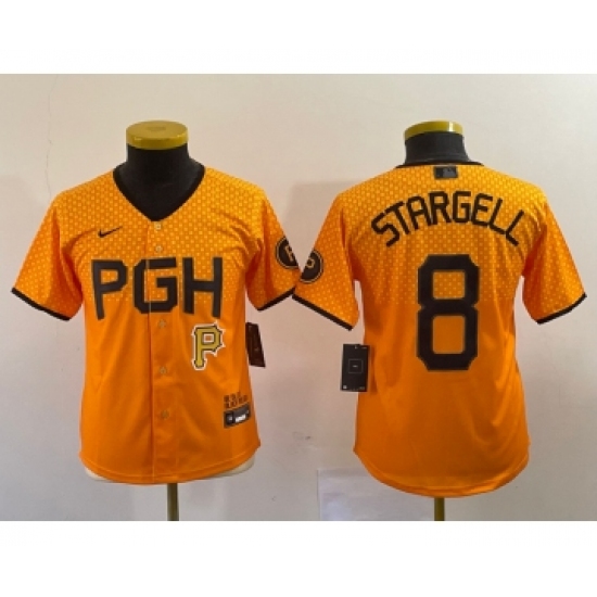 Youth Nike Pittsburgh Pirates #8 Willie Stargell Number Yellow 2023 City Connect Stitched Jersey5