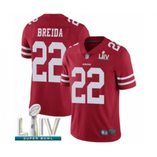>Youth San Francisco 49ers #22 Matt Breida Red Team Color Vapor Untouchable Limited Player Super Bowl LIV Bound Football Jersey